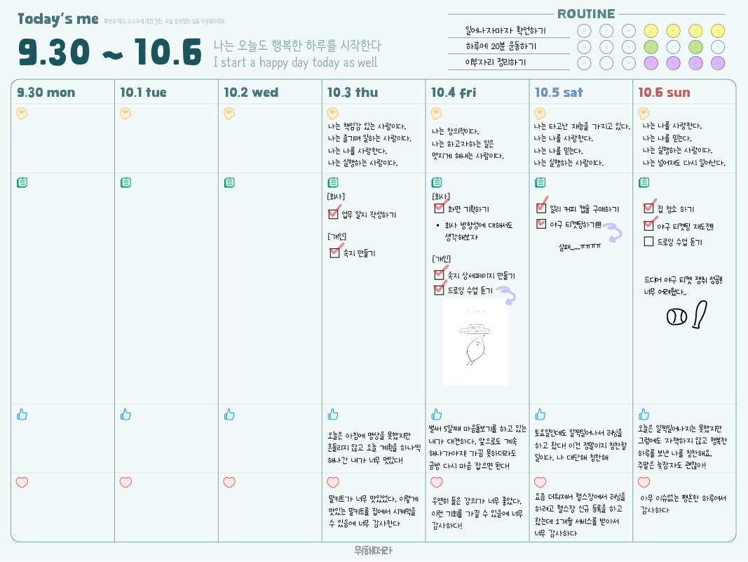 상단에는 주별로 다르게 확언을 적어두었으며, 10월과 동일한 내용으로 적어두었다:)