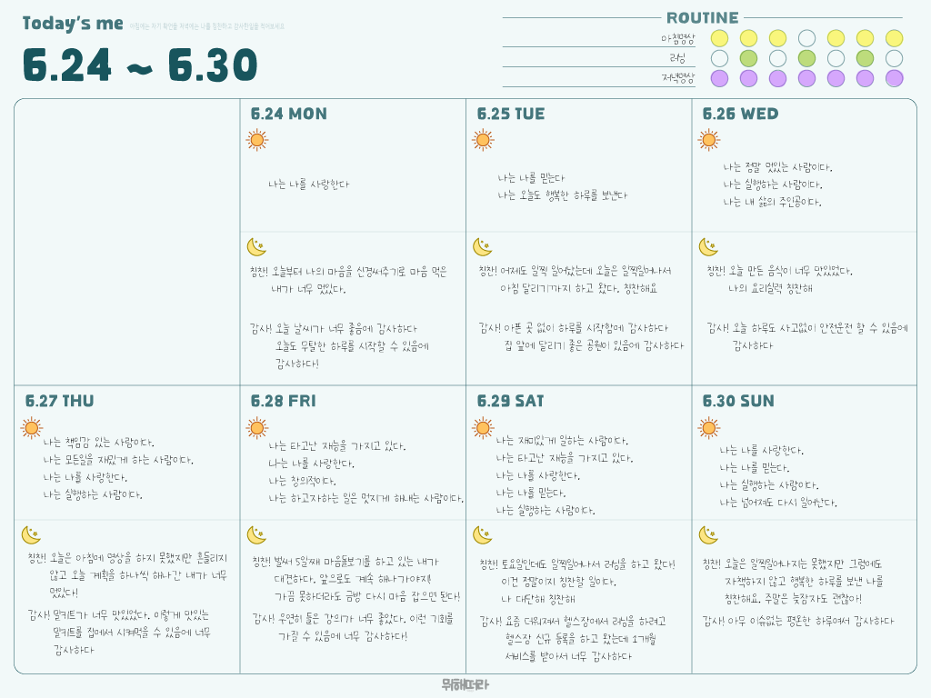 2~6페이지에는 나의루틴과 하루 확언, 나에 대한 칭찬, 감사 일기를 적을 수 있도록 구성하였다.